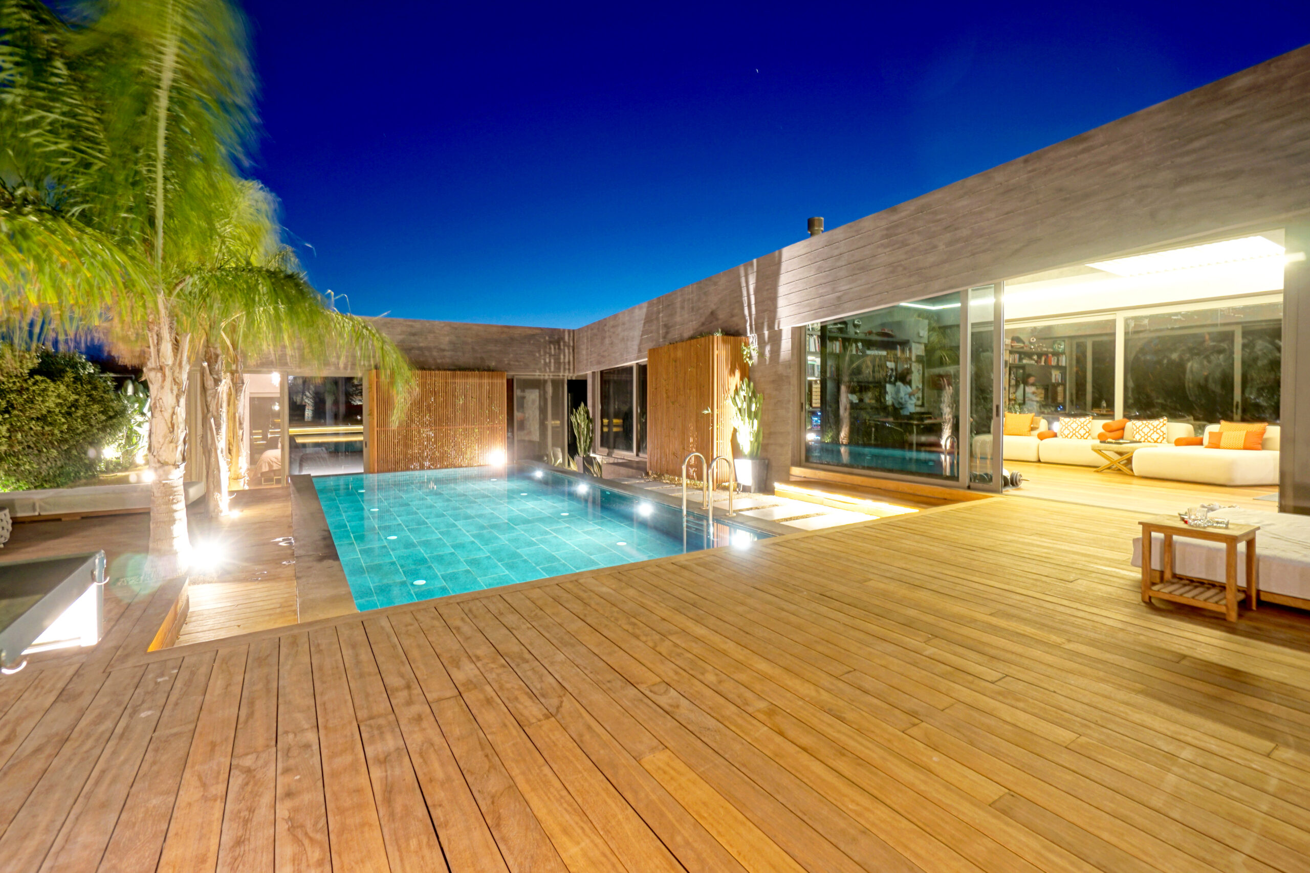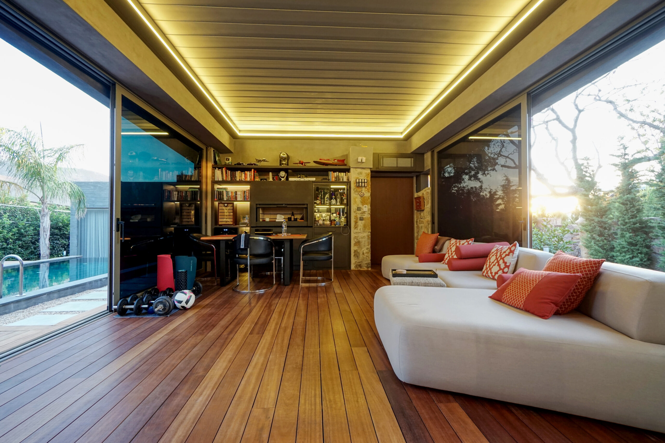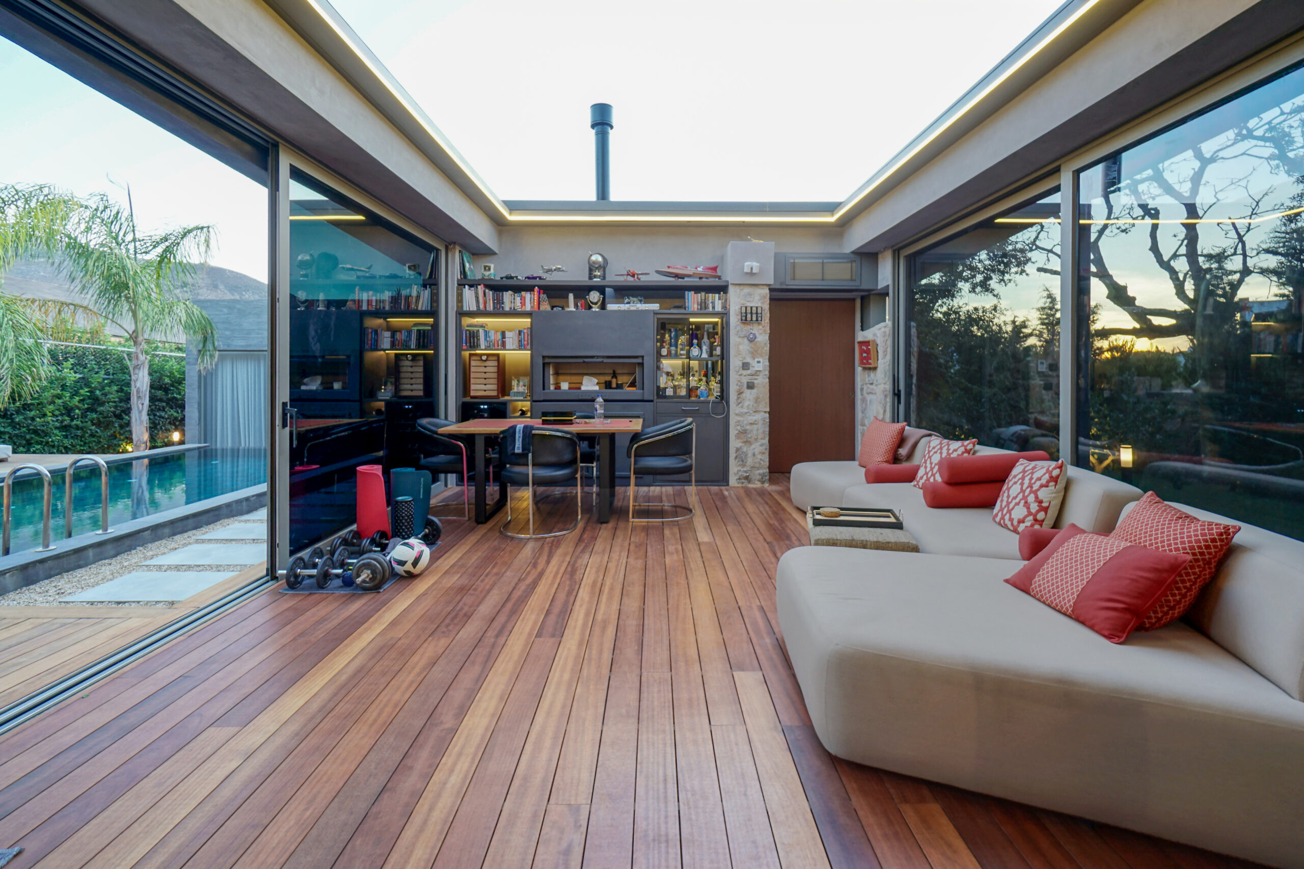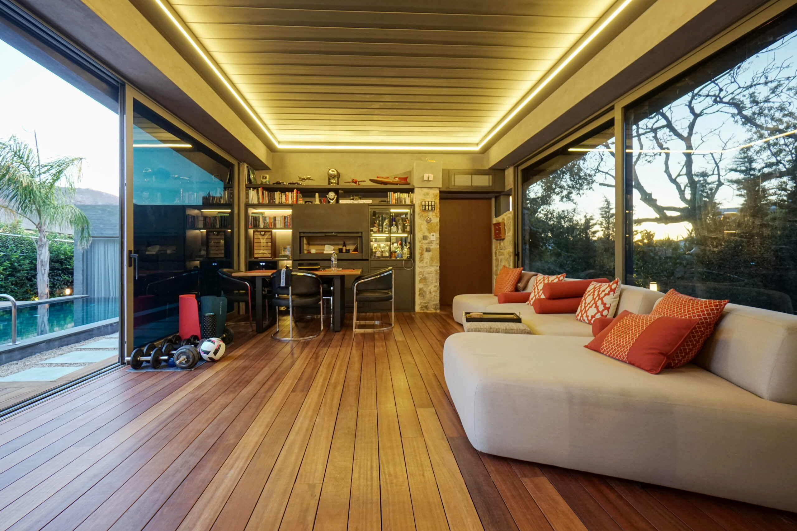 The front is all glass and can be opened completely, merging the inside with the pool area just metres away in a seamless transition