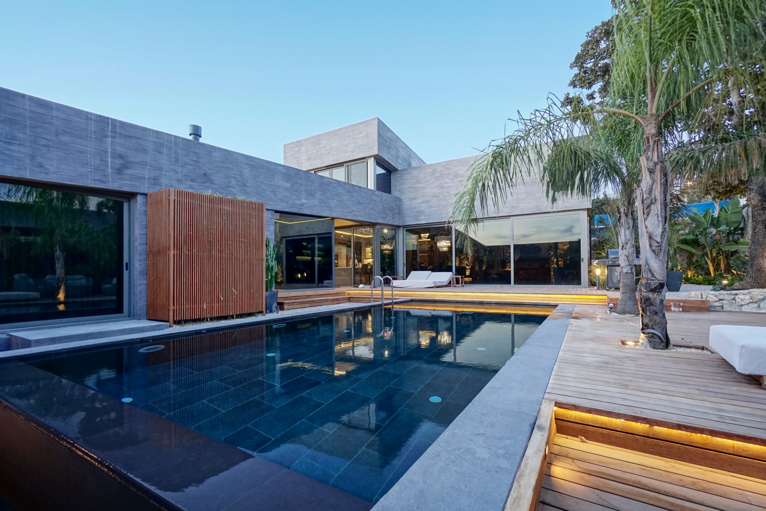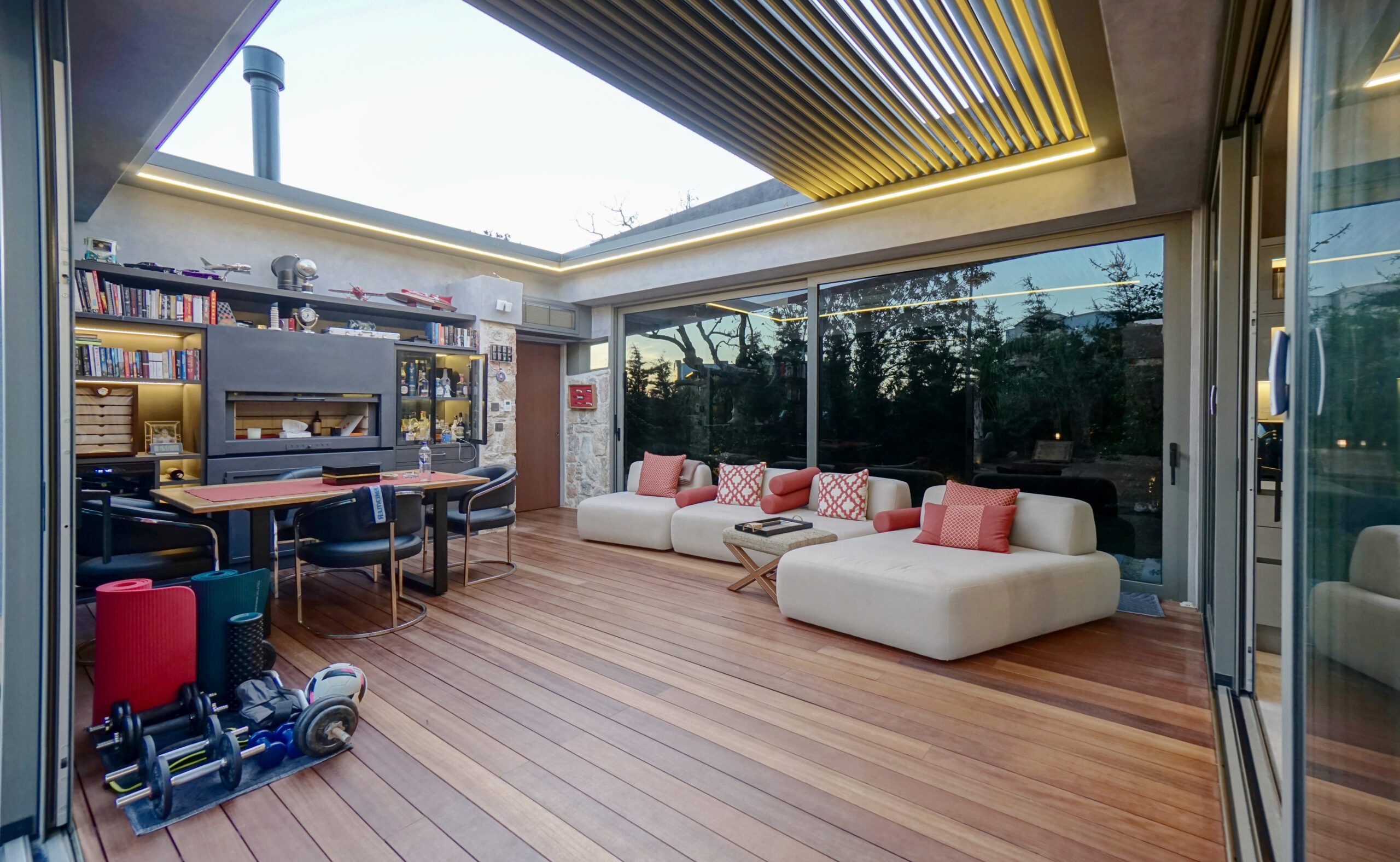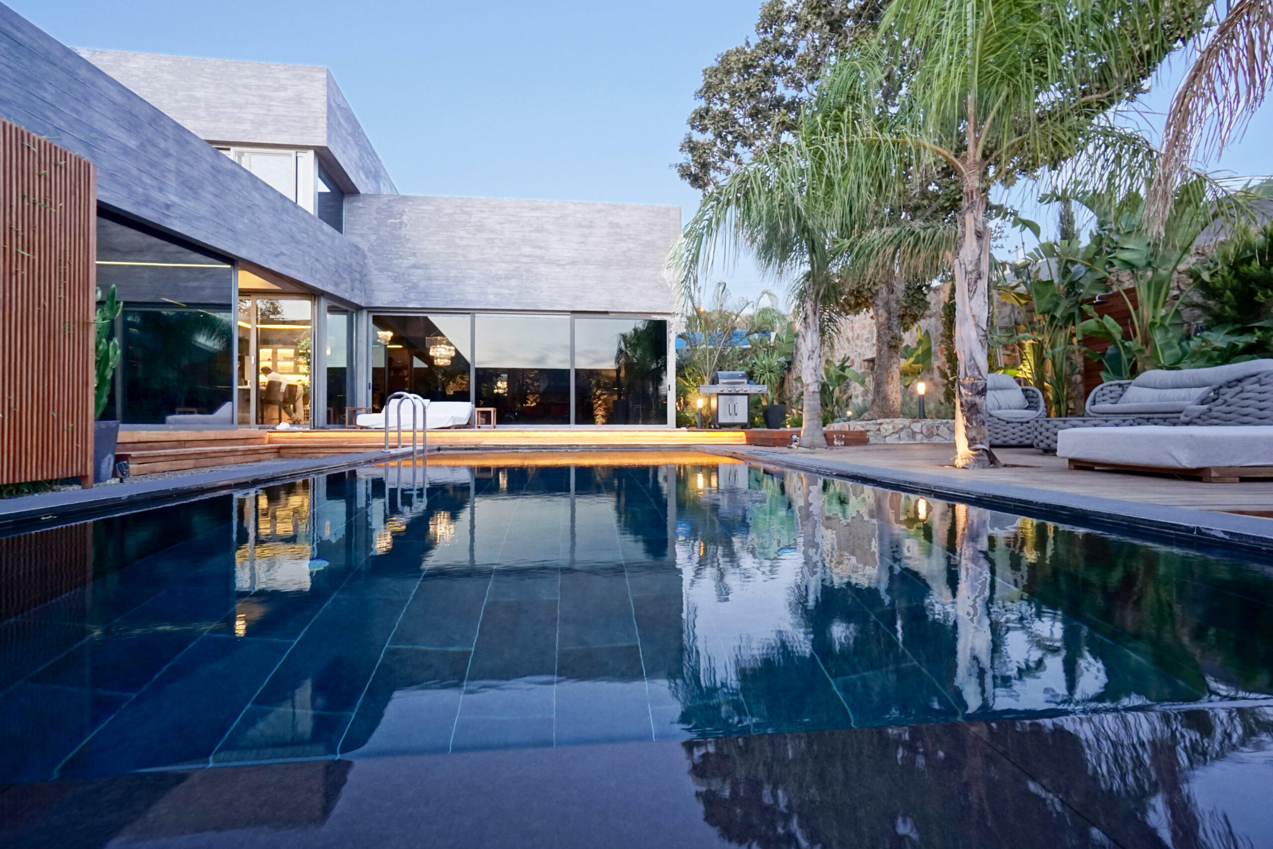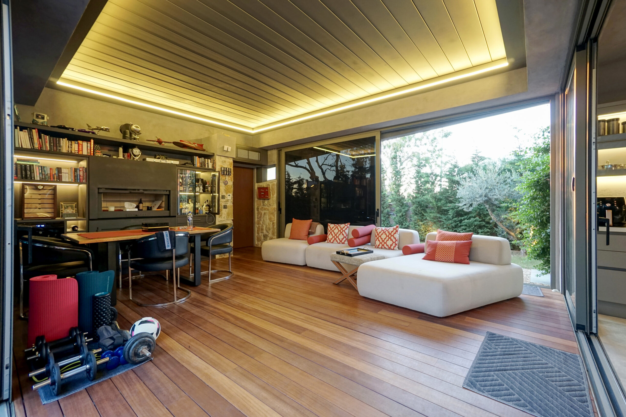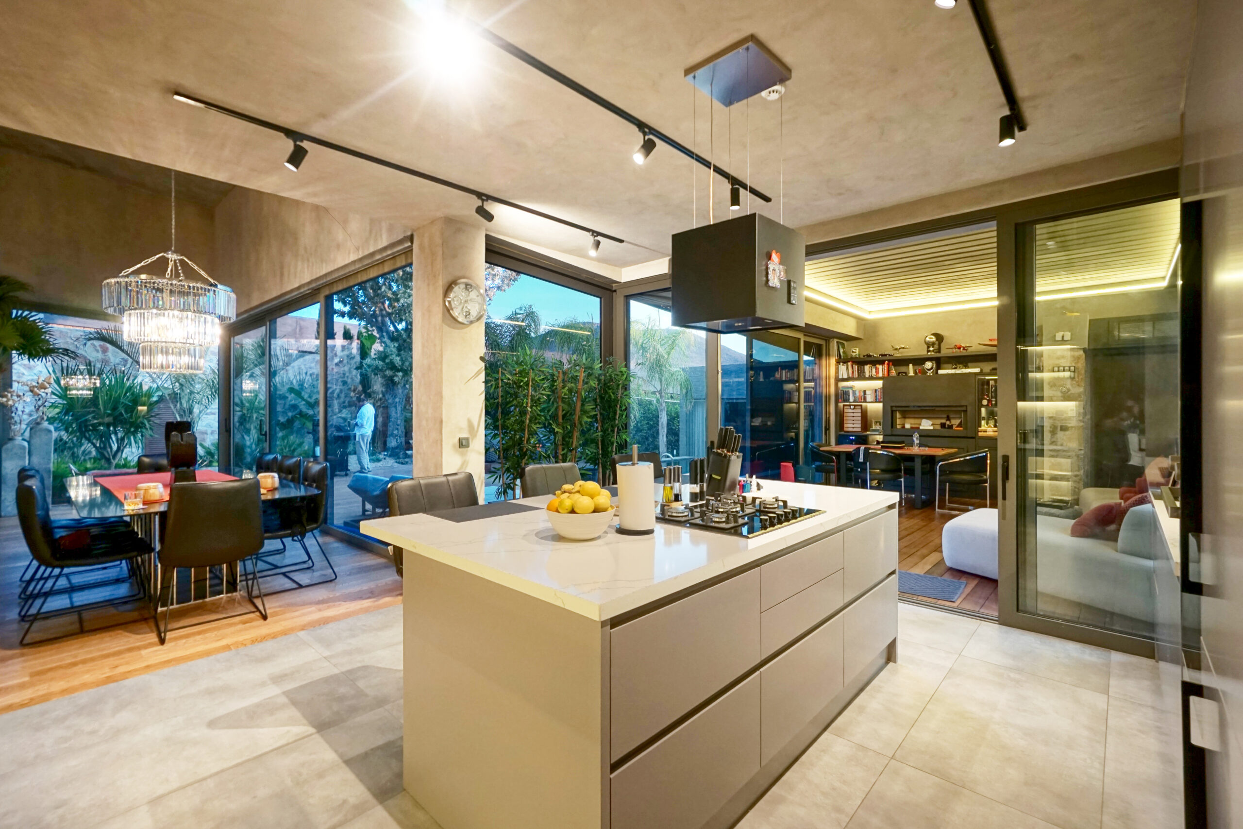 The front is all glass and can be opened completely, merging the inside with the pool area just metres away in a seamless transition
