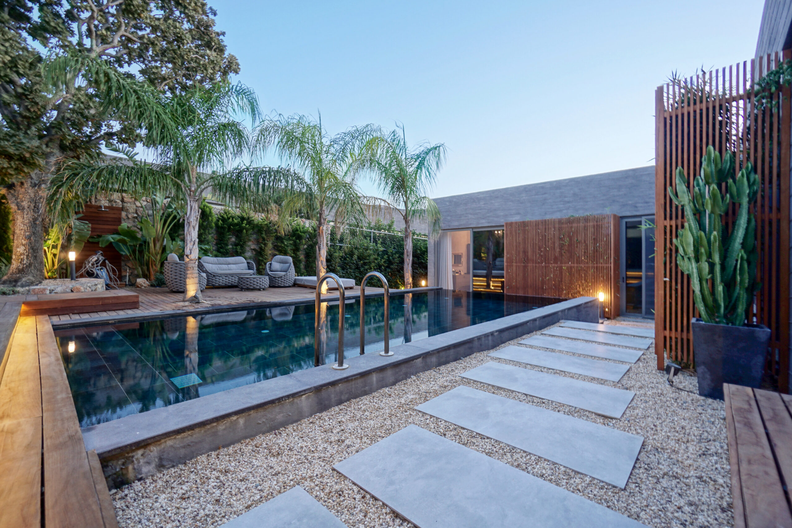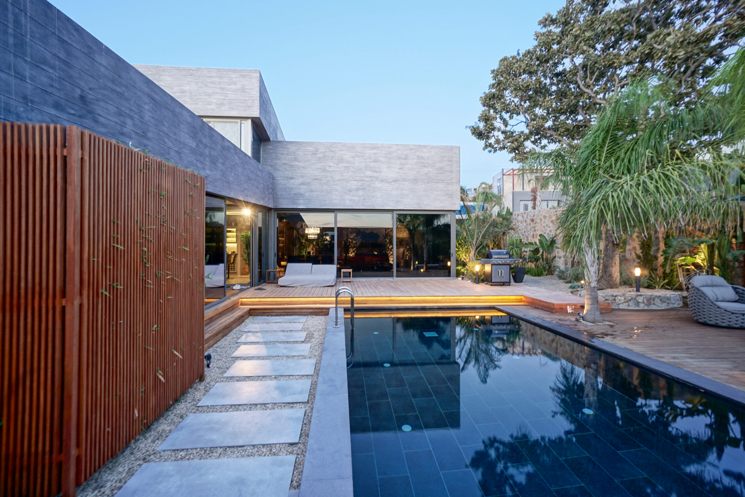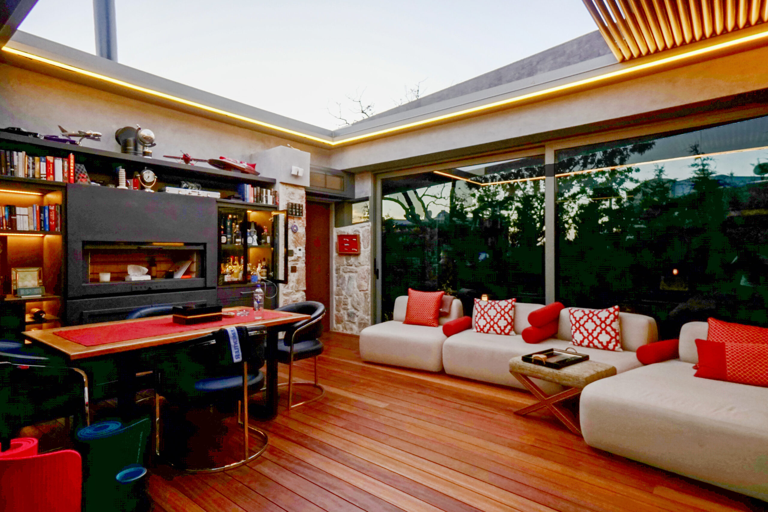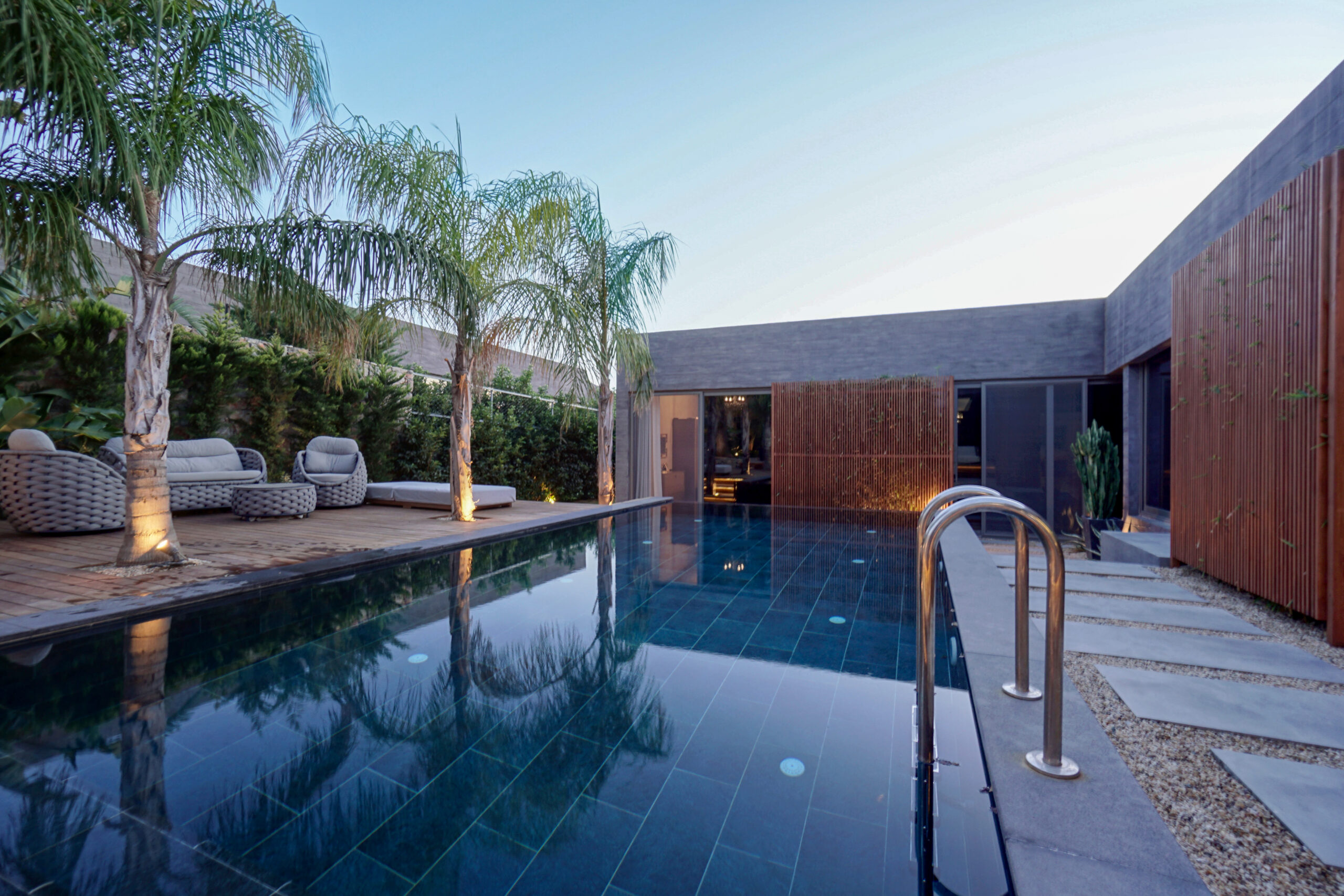 The front is all glass and can be opened completely, merging the inside with the pool area just metres away in a seamless transition