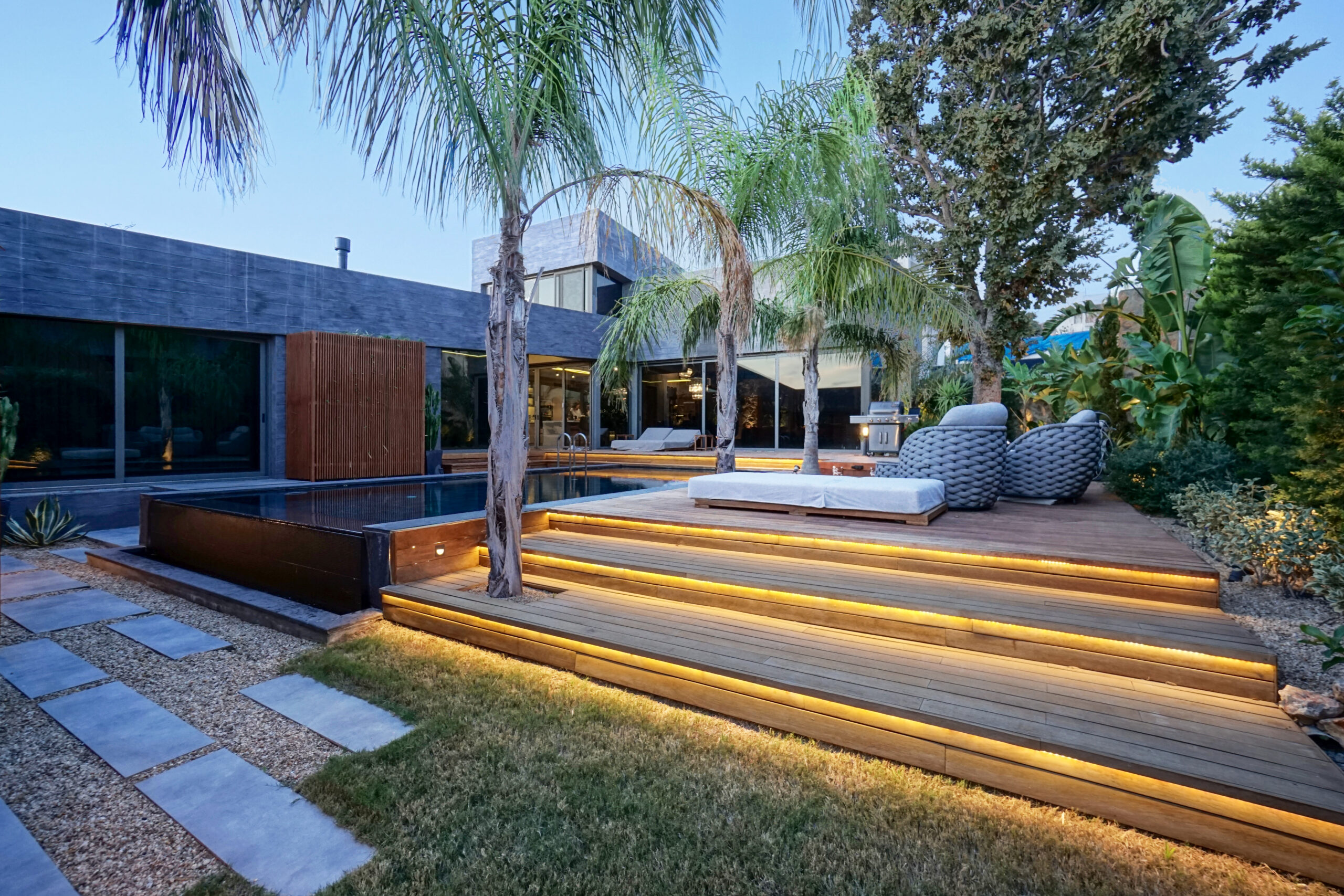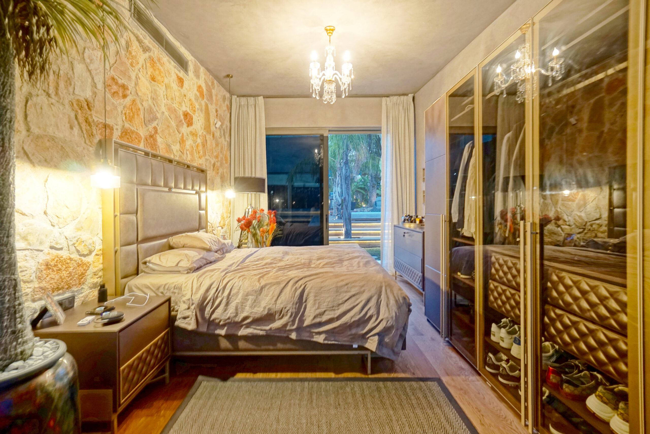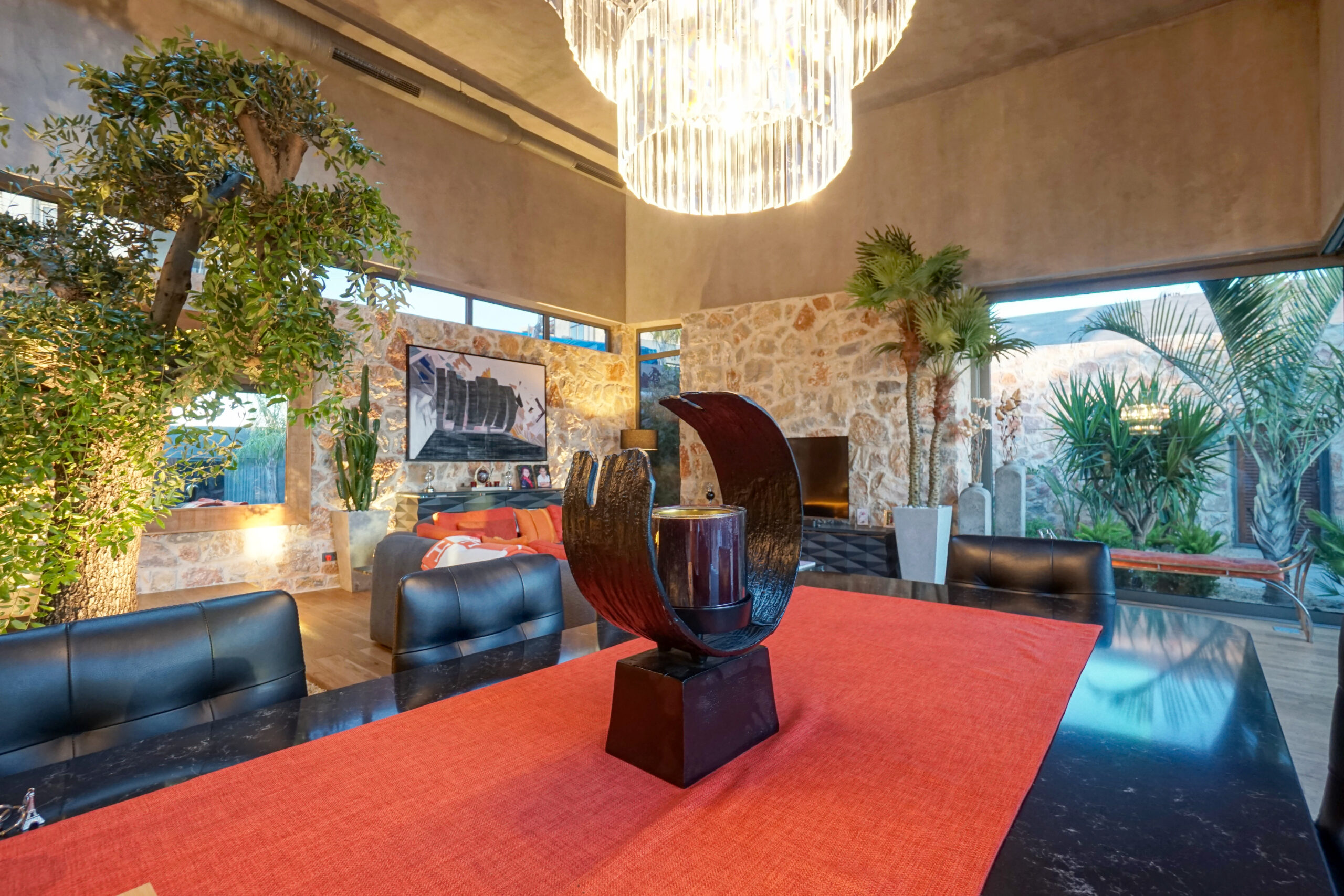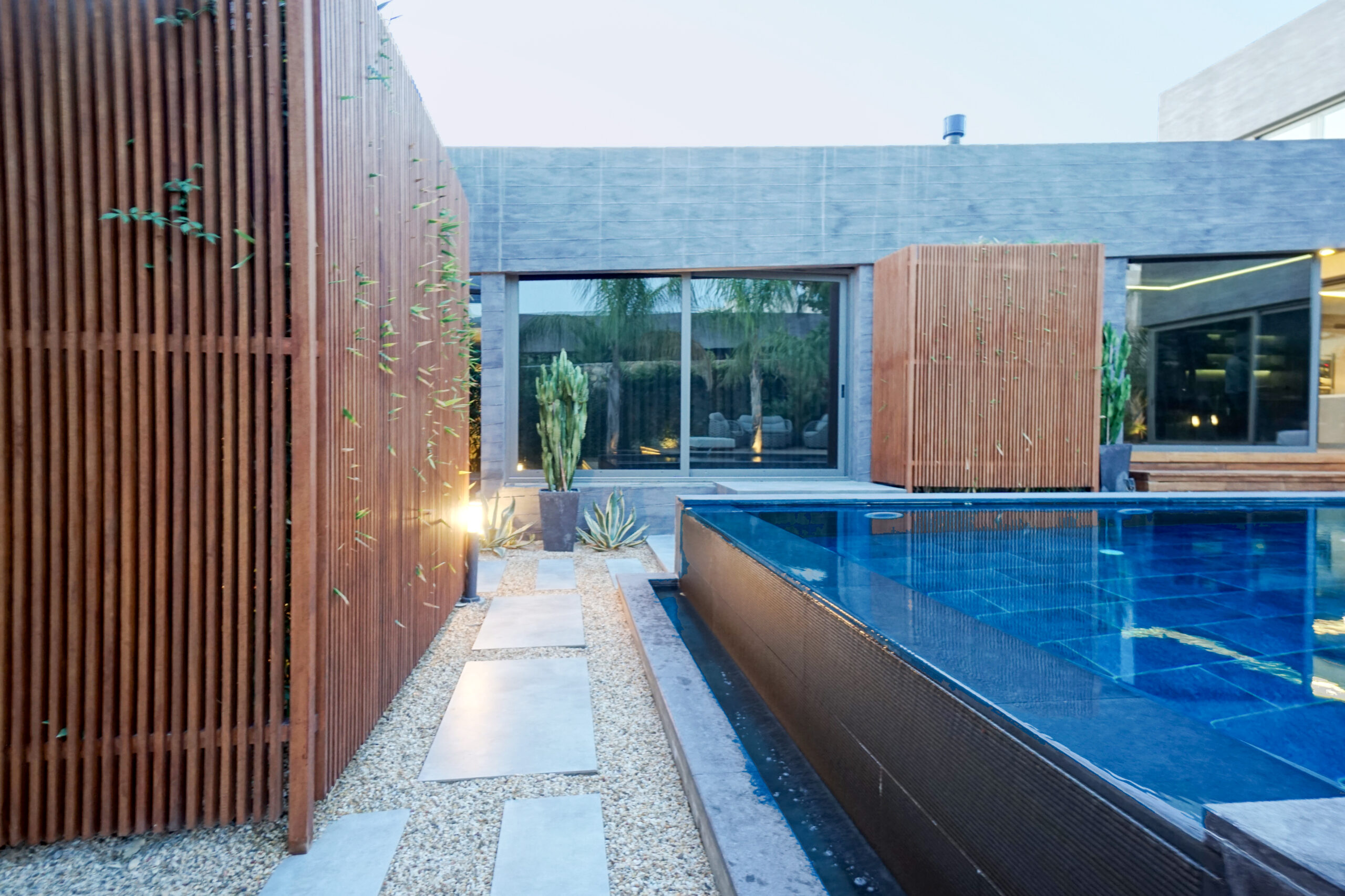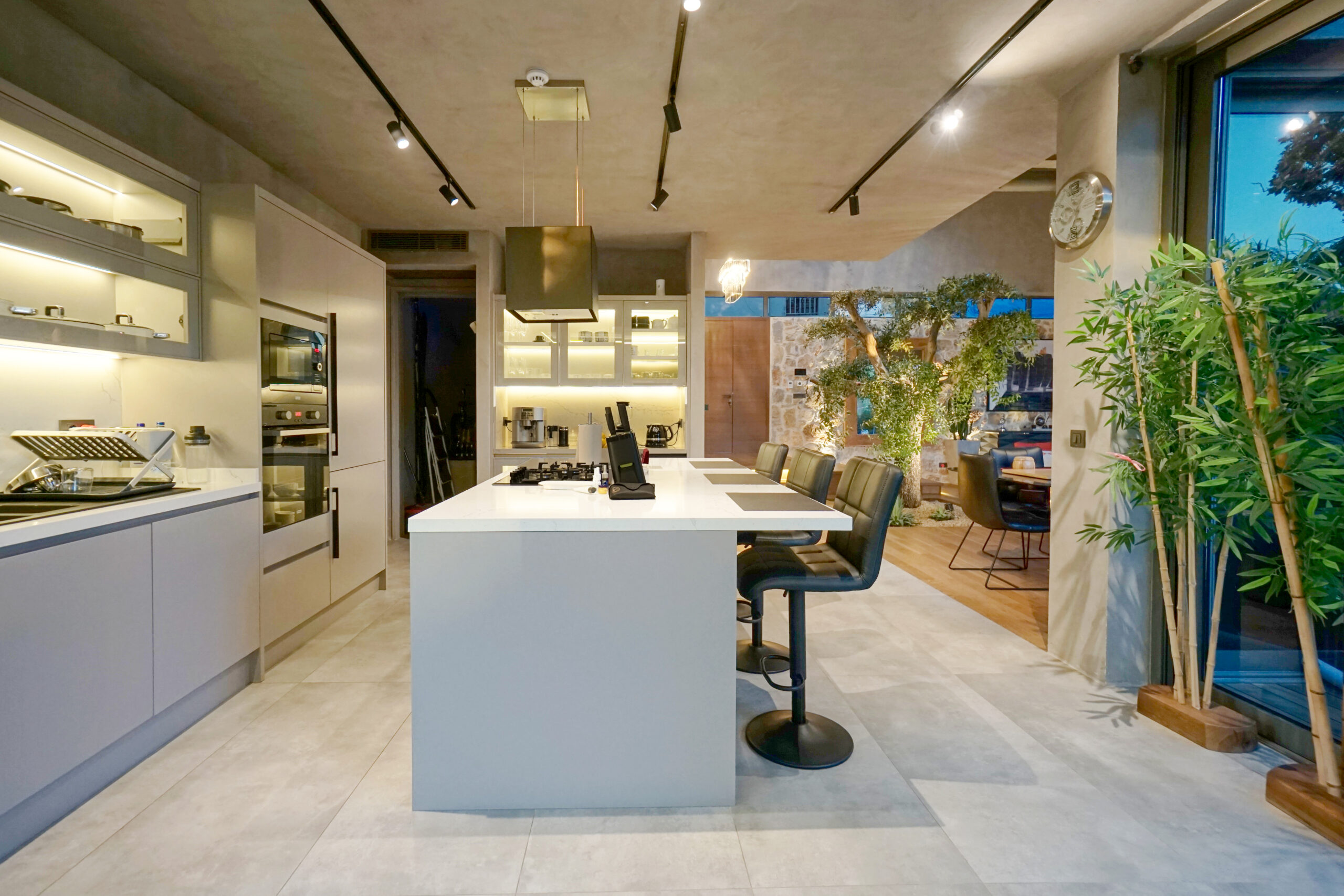 The front is all glass and can be opened completely, merging the inside with the pool area just metres away in a seamless transition