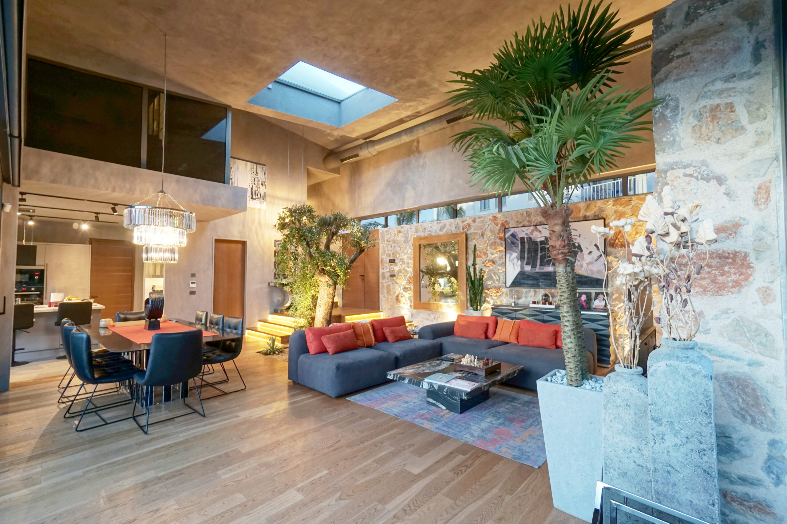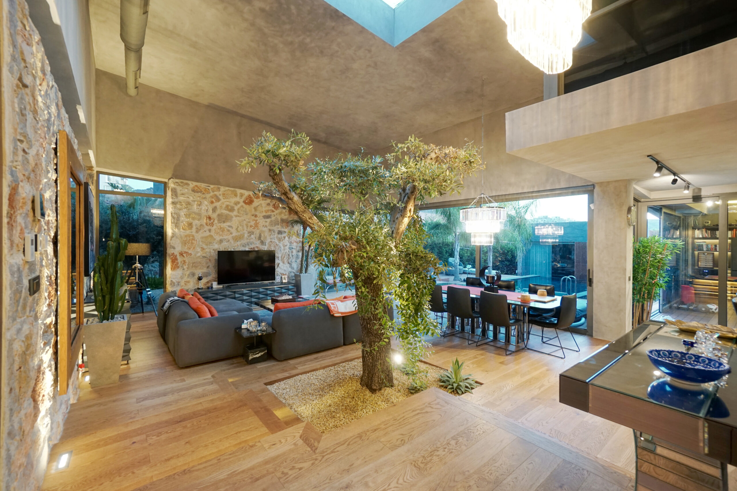 The house is split into three sections – the living area, the winter garden, and the sleeping quarters. The living area is located on one side of the U and consists of a spacious living room, designer kitchen, and dining space. A stunning glass facade opens up and merges the garden and the villa as one.