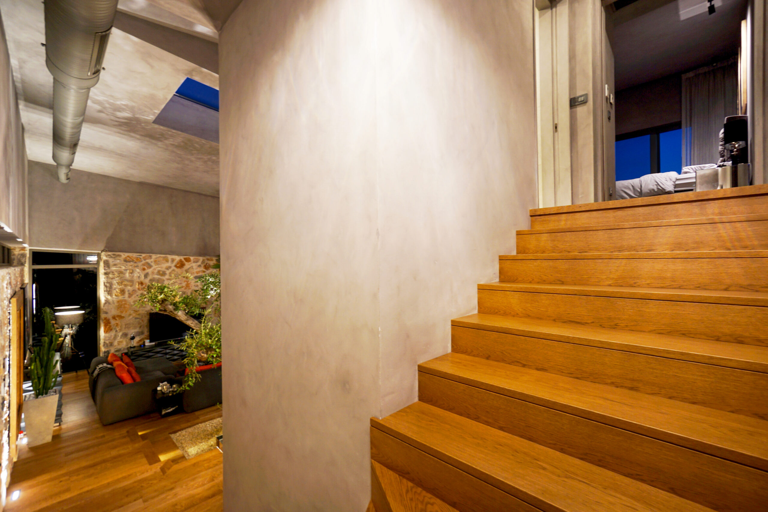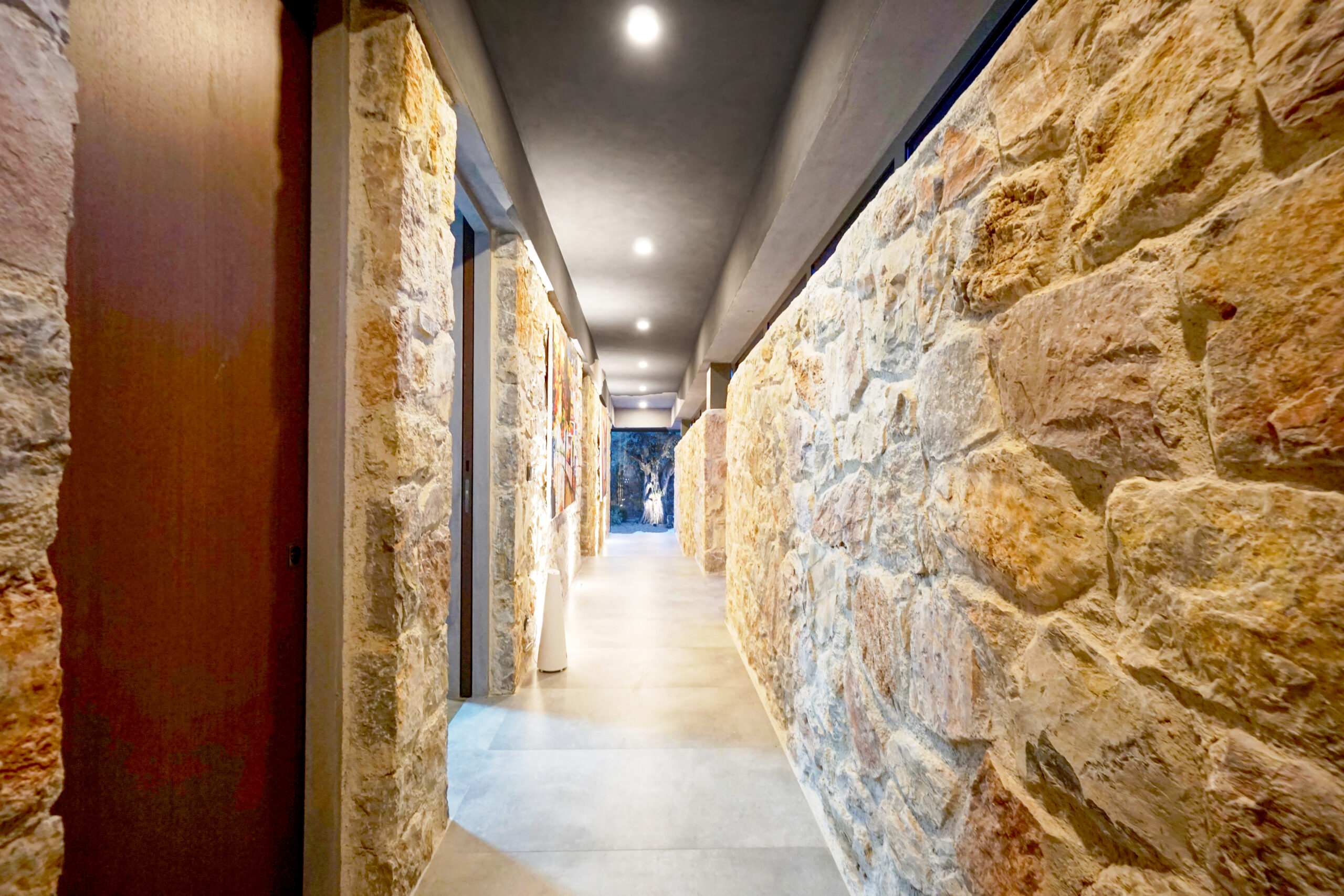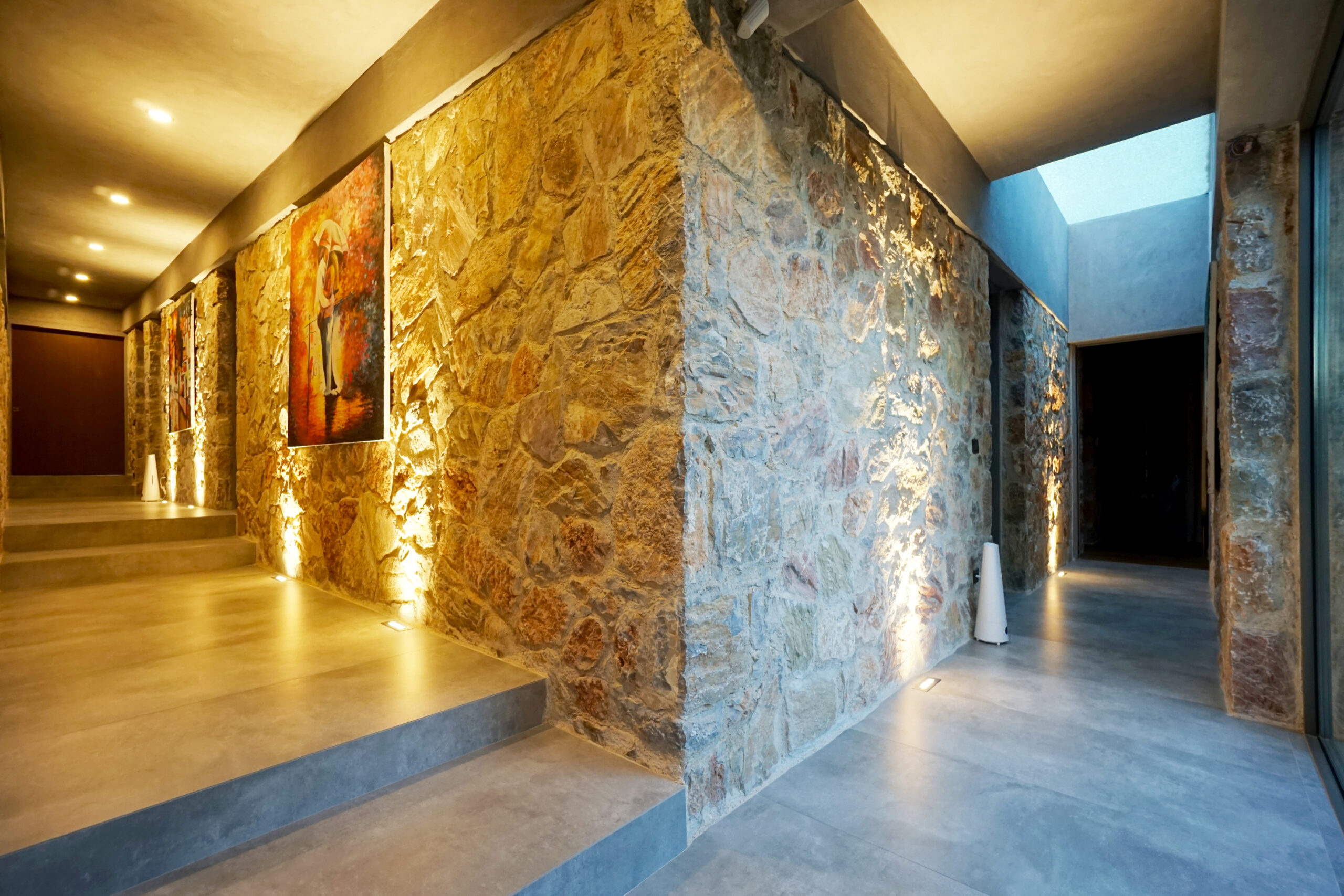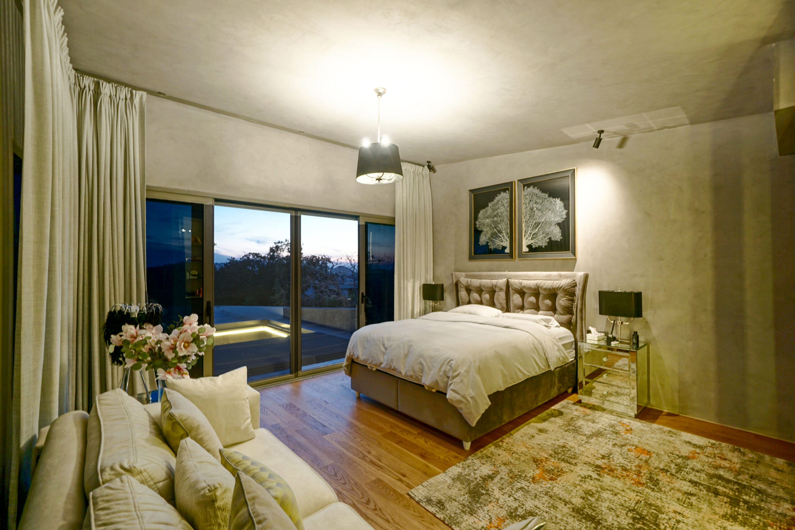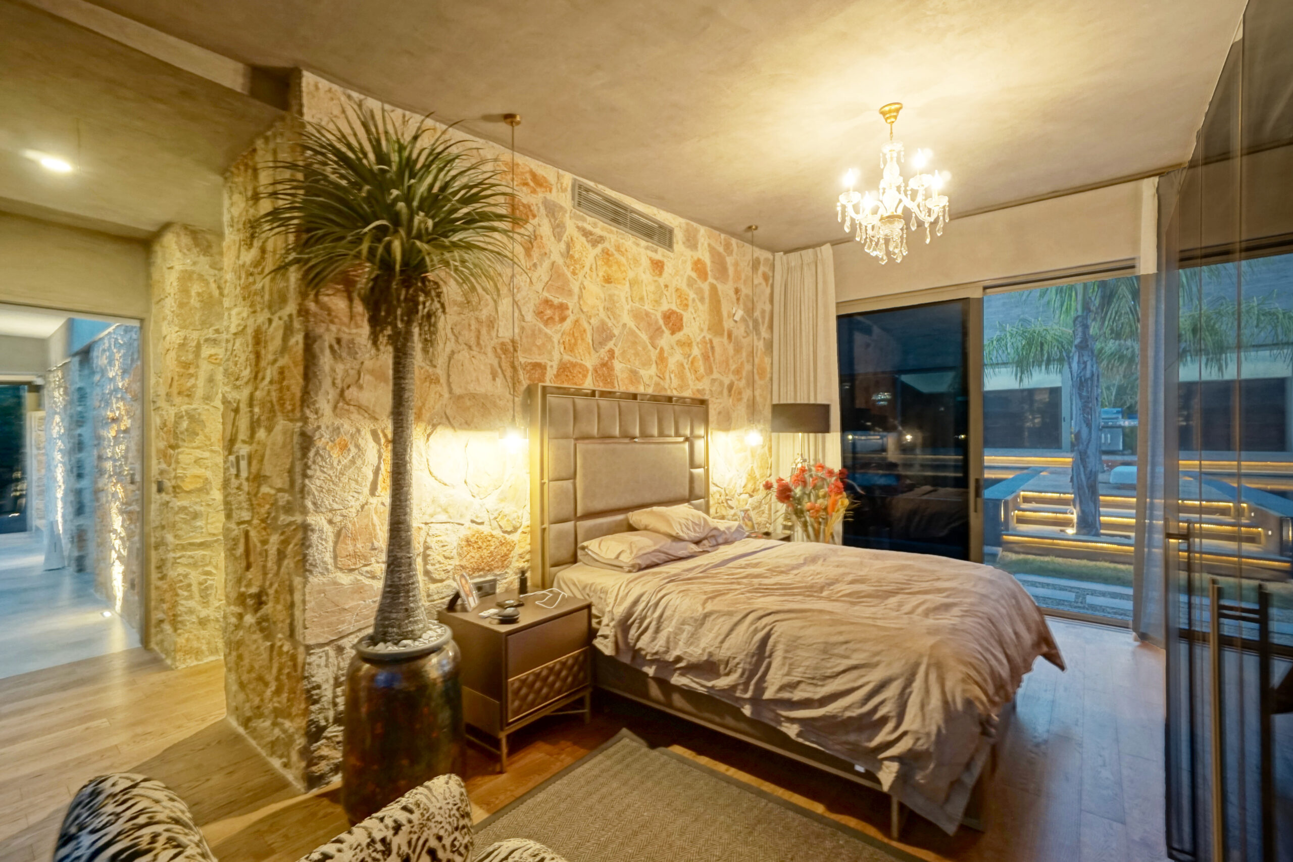 Three rooms have en-suite private bathrooms attached. Rooms have complete glass facades with outstanding views and access to the middle garden. There is a master bedroom located above the living room, complete with beautiful sea and sunset view.