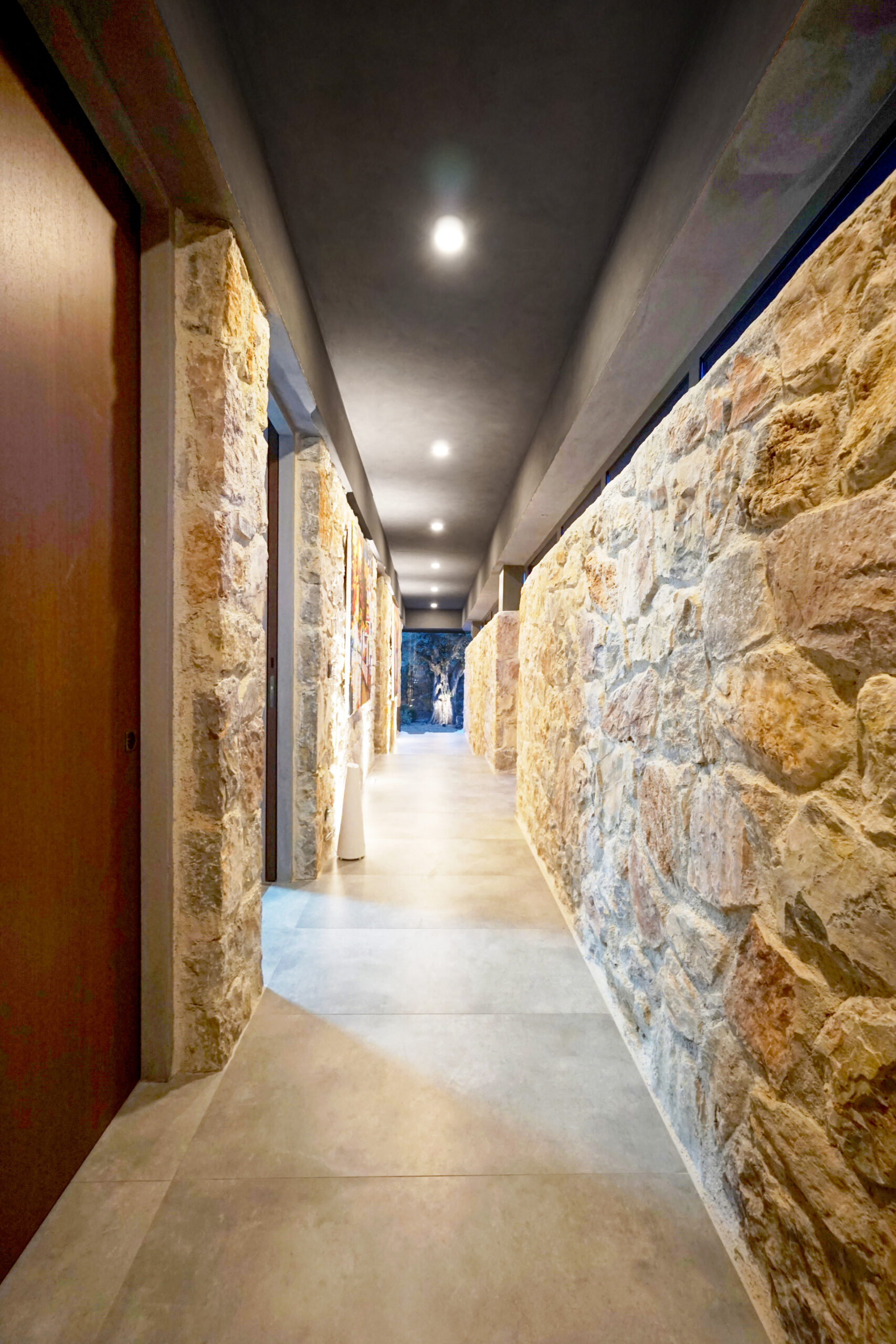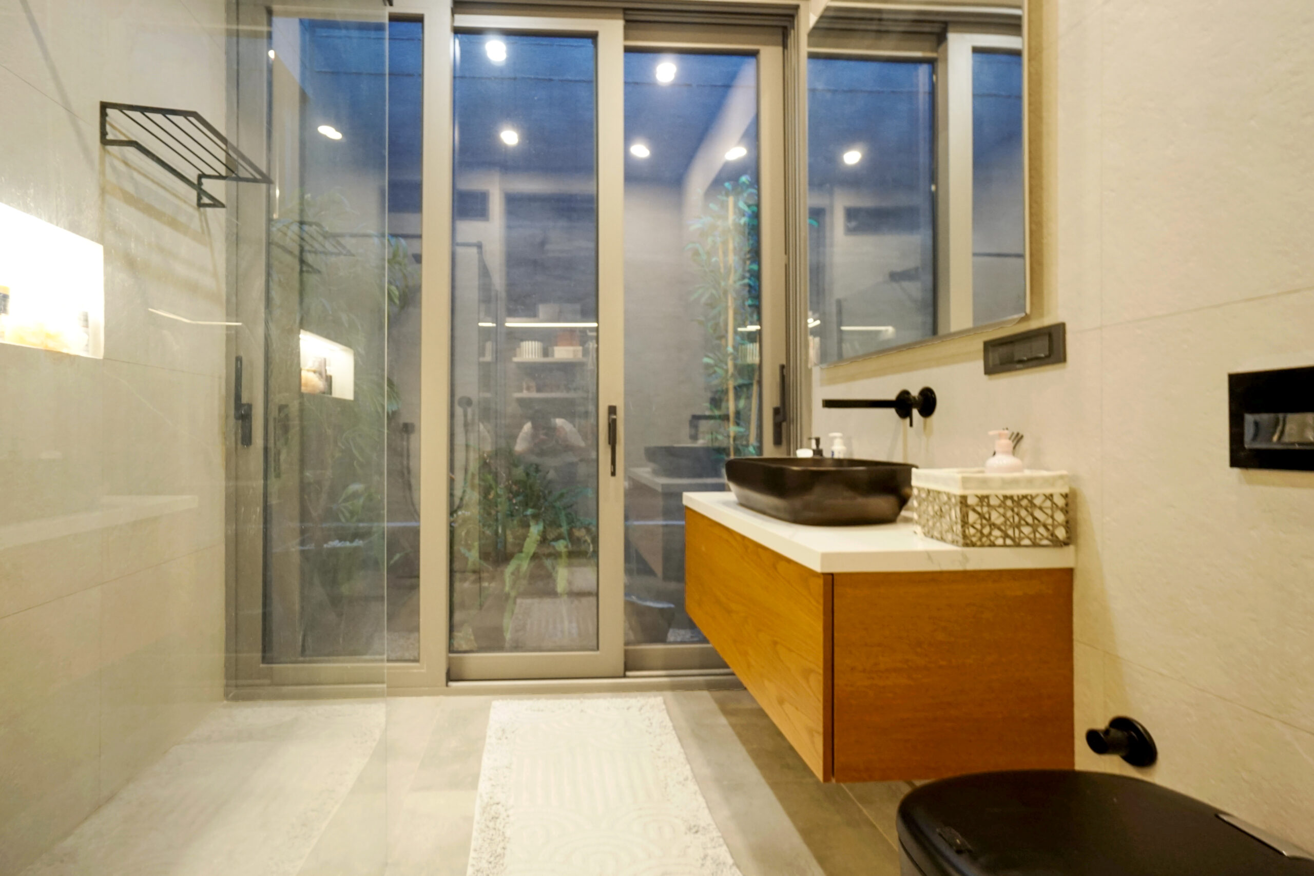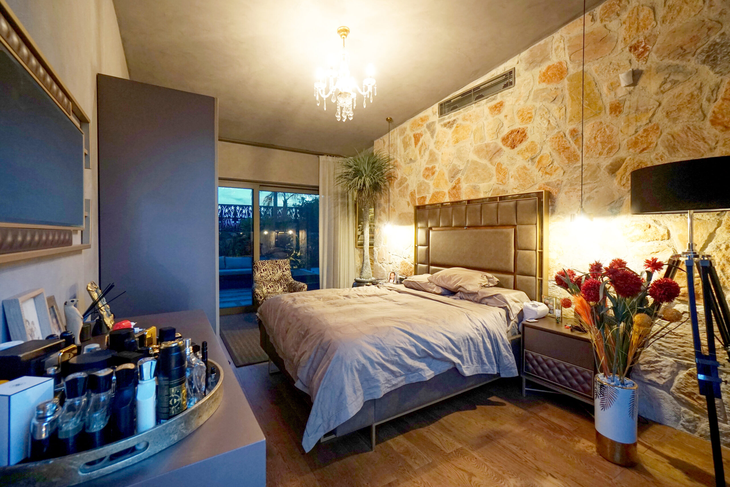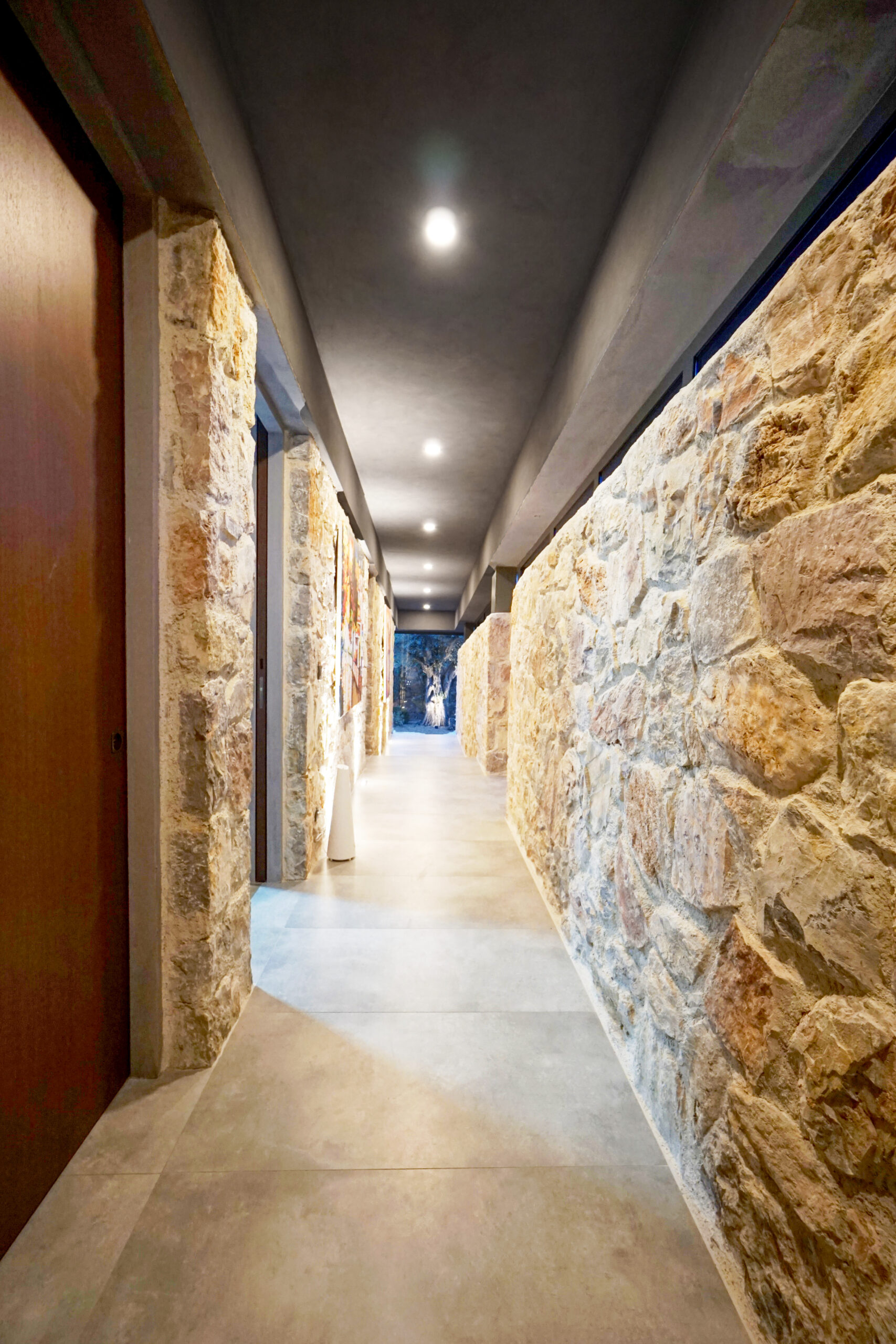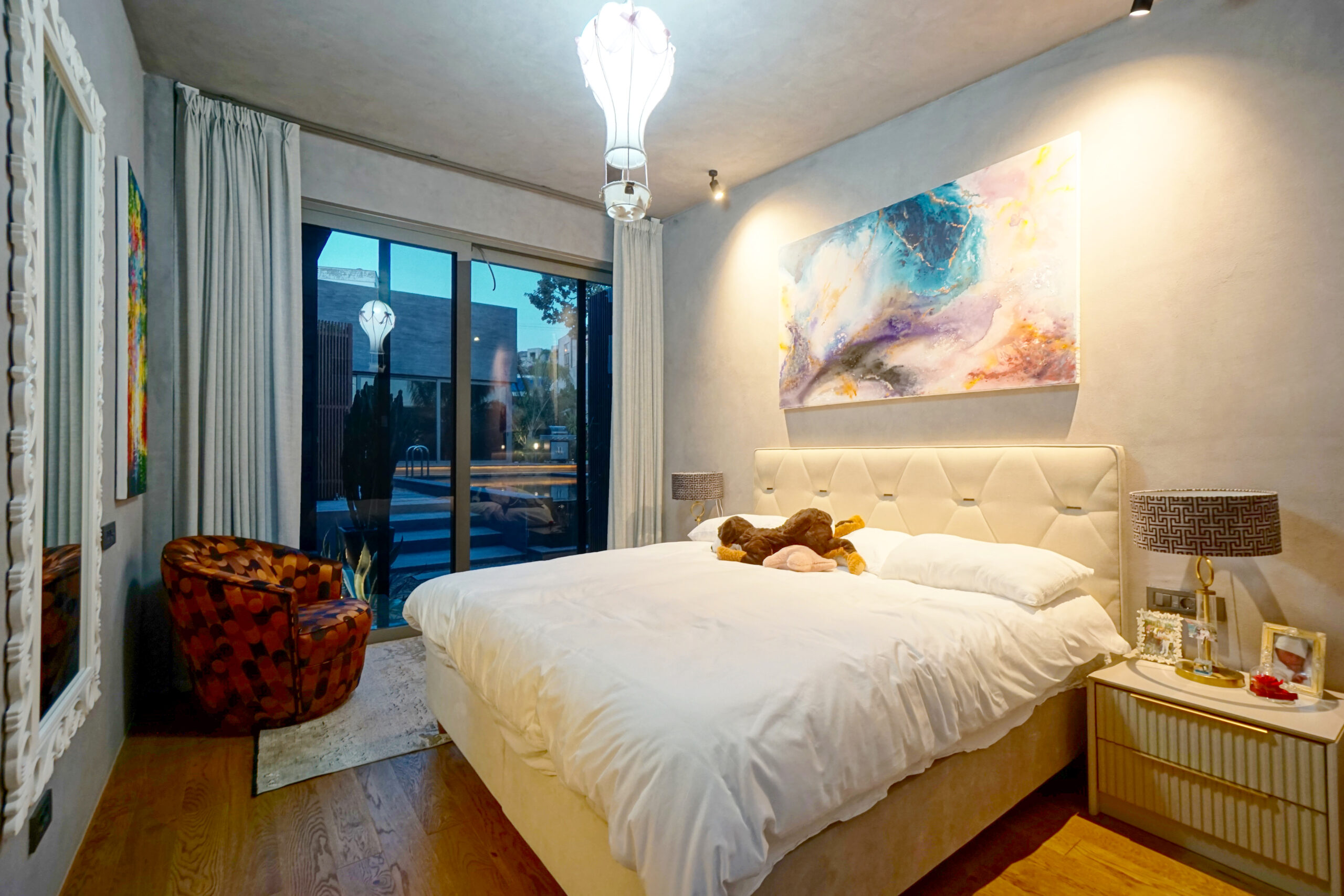Three rooms have en-suite private bathrooms attached. Rooms have complete glass facades with outstanding views and access to the middle garden. There is a master bedroom located above the living room, complete with beautiful sea and sunset view.